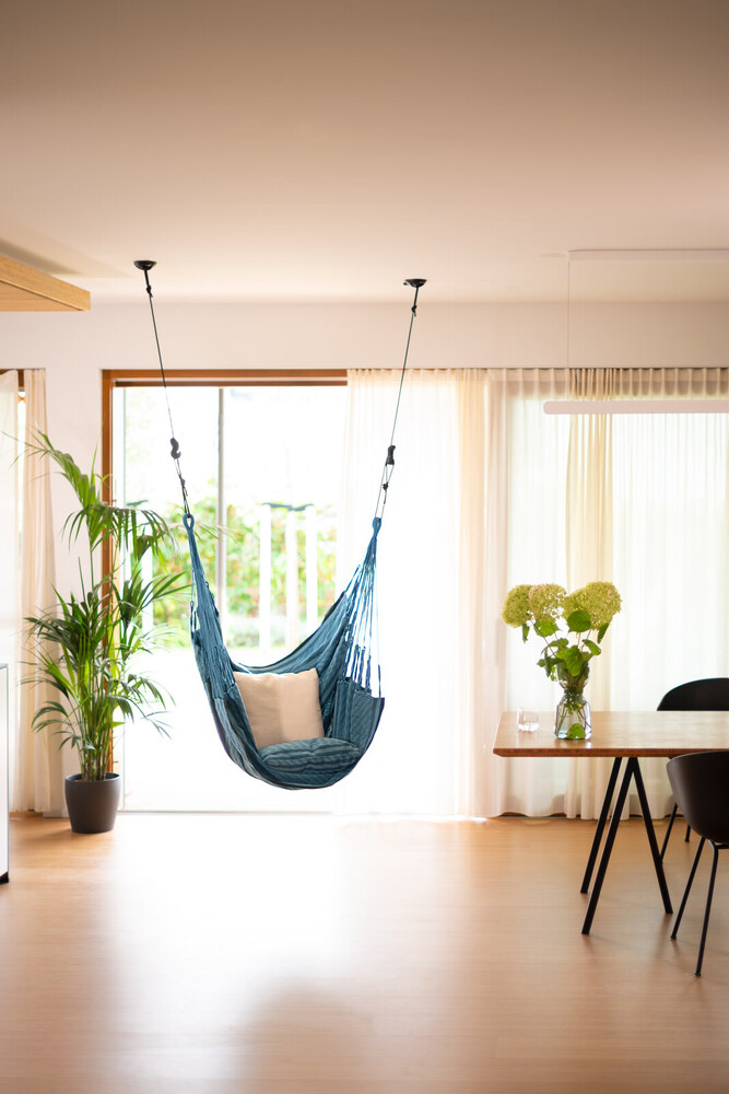 - Felakaszthatod a plafonra (vagy fák közé, bárhová) két pontos rögzítéssel, lásd a galériát.