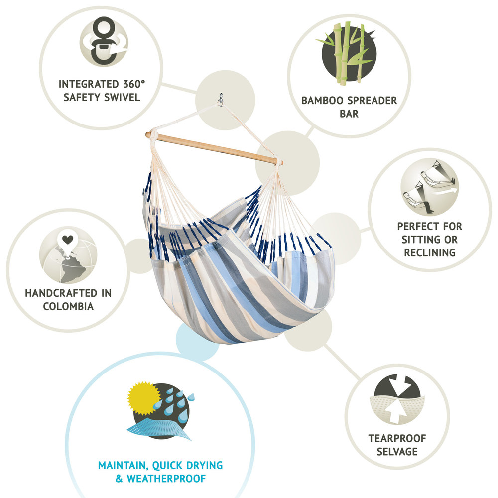 A dupla vetülékszálak biztosítják, hogy a függőszék szakadásbiztos legyen, és hosszan élvezhesse használója a Domingo adta kényelmet. A teherelosztó farúd kiváló minőségű keményfából készült, mely az Erdőgondnoksági Tanács (FSC®-Forest Stewardship Council®) által ellenőrzött erdőkből származik. A La Siesta függőszékek különleges jellemzője az integrált biztonsági forgó, amely a függőszék forgását könnyűvé és ezáltal hosszan használhatóvá teszi. Ha tökéletes pihenőhelyet szeretne kertjébe, válassza a Domingo függőszéket.