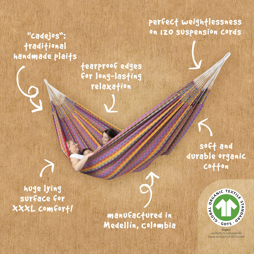 A Flora függőágy szálai 100% tiszta biopamutból készülnek, amit a hitelesített szerves művelés tesz lehetővé. Lélegzetelállítóan gyönyörű természetes színek, melyek tökéletesen illeszkednek életének hangulatához. Hatalmas méret az extra kényelemért.