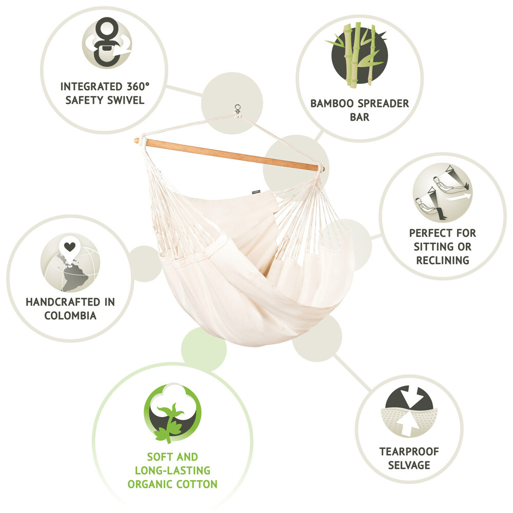 A nagyszámú zsinórzat a kolumbiai függőszékek általános jellemzője. A súlyeloszlás használat közben optimális a függőfotel a zsinóroknak köszönhetően maximális kényelmet nyújt, miközben igen strapabíró. A textil megerősített szélei nagy szakítószilárdságot biztosítanak a függőfotelnek. A beépített biztonsági forgószem biztonságos 360 fokos elforgást tesz lehetővé. A távtartó rúd csúcsminőségű bambuszból készült, amely nem csak vonzó küllemű, de rendkívül erős és vízálló. Emellett az sem elhanyagolható, hogy a függőágy fa alkotóelemei felelős erdőgazdálkodásból származnak(FSC®).