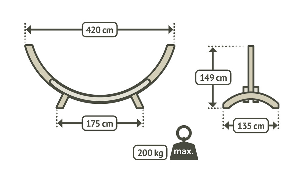 A függőágyállvány helyének kiválasztásakor ügyelj arra, hogy a talaj vízszintes legyen, és ne legyen túl nedves, hogy elkerüld a nem kívánt elmozdulást vagy elsüllyedést. Az állvány szükség szerint áthelyezhető és mozgatható, így nincs helyhez kötve. A függőágyszezon után azt javasoljuk, hogy szereld szét az állványt és tárold száraz helyen. A tavaszi összeszerelés előtt javasoljuk, hogy a fát keményviaszolajjal kezeld.