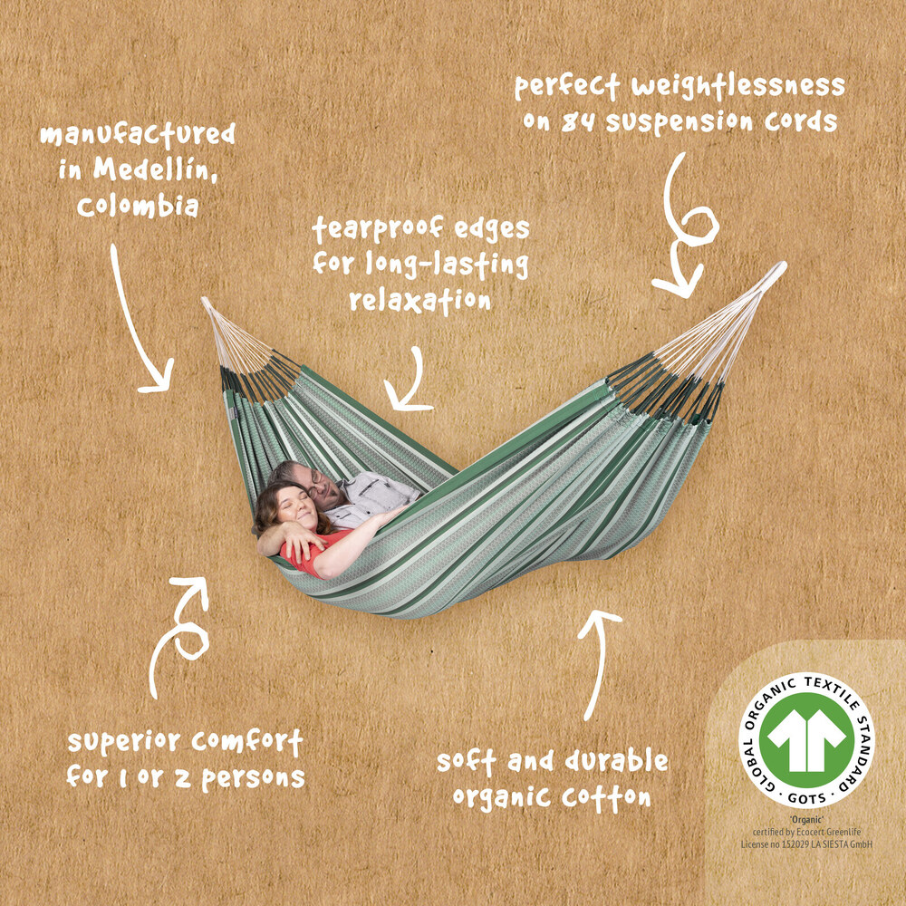 A Modesta függőágy szálai 100% tiszta biopamutból készülnek, amit a hitelesített szerves művelés tesz lehetővé. Lélegzetelállítóan gyönyörű természetes színek, melyek tökéletesen illeszkednek életének hangulatához. Hatalmas méret az extra kényelemért.