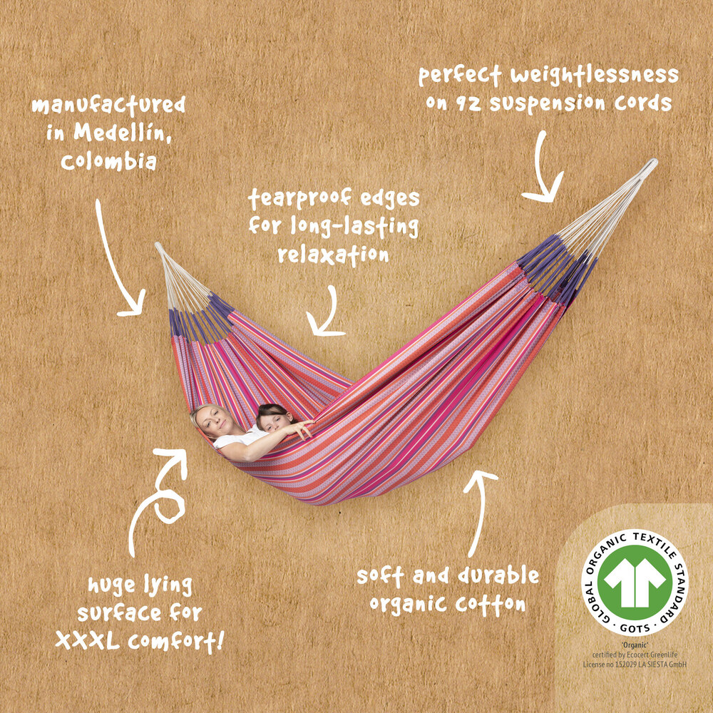 A Modesta függőágy szálai 100% tiszta biopamutból készülnek, amit a hitelesített szerves művelés tesz lehetővé. Lélegzetelállítóan gyönyörű természetes színek, melyek tökéletesen illeszkednek életének hangulatához. Hatalmas méret az extra kényelemért.