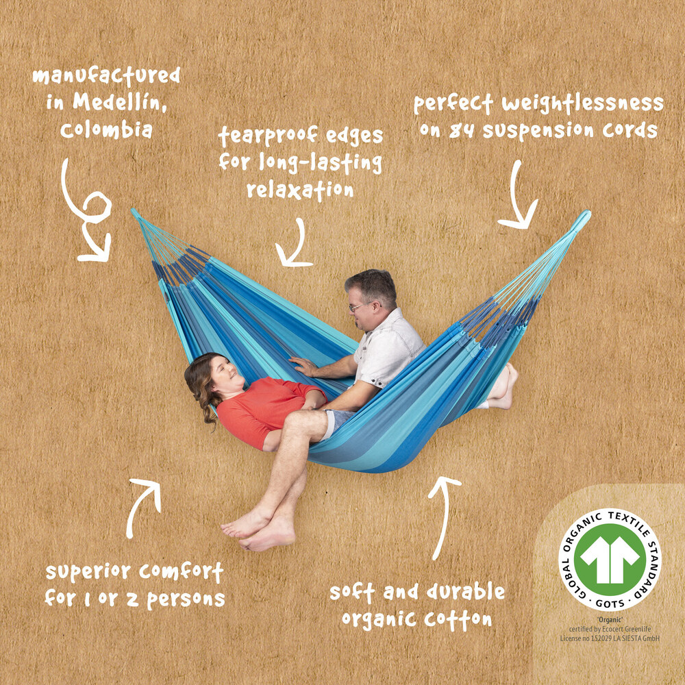 A Modesta függőágy szálai 100% tiszta biopamutból készülnek, amit a hitelesített szerves művelés tesz lehetővé. Lélegzetelállítóan gyönyörű természetes színek, melyek tökéletesen illeszkednek életének hangulatához. Hatalmas méret az extra kényelemért.
