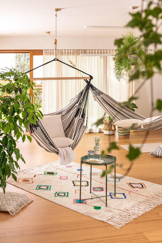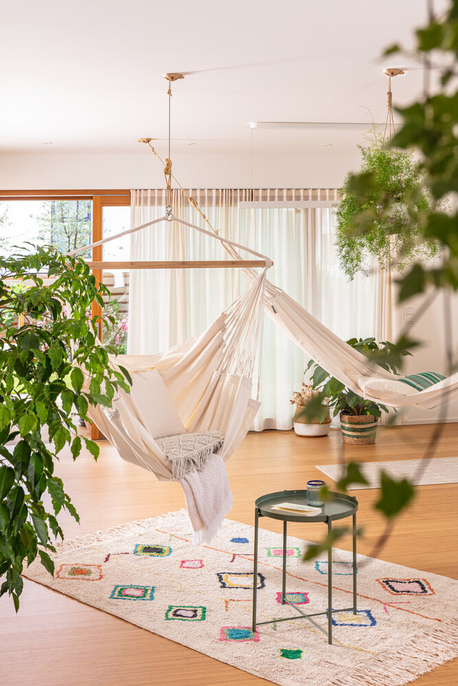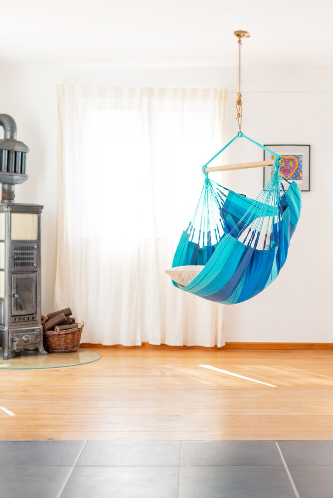A konstrukció nagyon praktikus, az anyag ellenáll az UV-sugaraknak és időjárásálló. A felfüggesztés ezen módja nem csupán leegyszerűsíti a kötél hosszának beállítását, de lehetővé teszi a függőszék gyors felszerelését és eltávolítását.