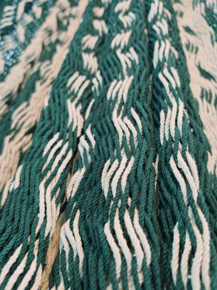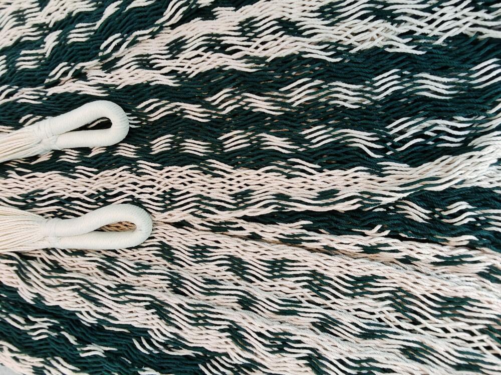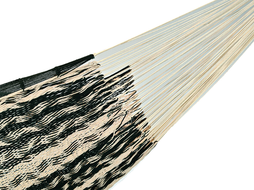 A hagyományos 'sprang' szövési technikának köszönhetően a függőágy tökéletesen felveszi a test alakját. A párhuzamos, de egymásba hurkolt szálak olyan felületet alkotnak, amely hosszanti irányban fix, keresztben rugalmas. A legnagyobb hőségben is szellős, kellemesen hűsít a szálak között átjáró levegő.