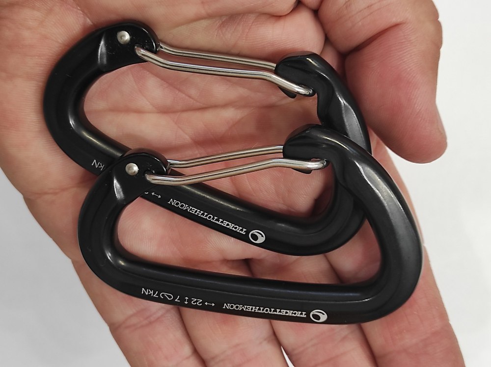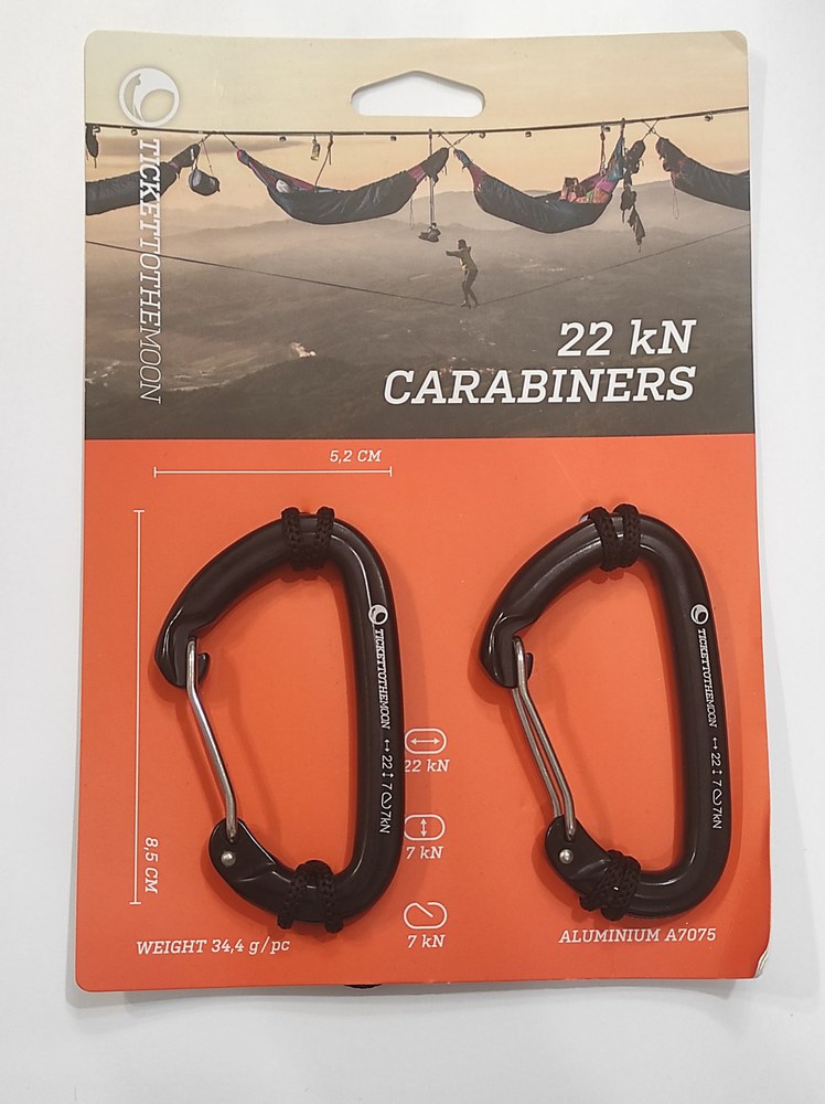 A Ticket To The Moon függőágyak végén egy roppant erős S kampó található alapestben, amivel könnyedén felakasztható a hozzá tartozó kötélre. Vannak, akik mégis jobban szeretik a karabinerrel szerelést, nekik gyárt a Ticket To The Moon pille könnyű de nagy teherbírású karabinereket. Úgy tervezték, hogy a kötelek elhelyezkedése optimális legyen, és a karabiner soha ne tegyen kárt sem a kötélben, sem a függőágy anyagában.