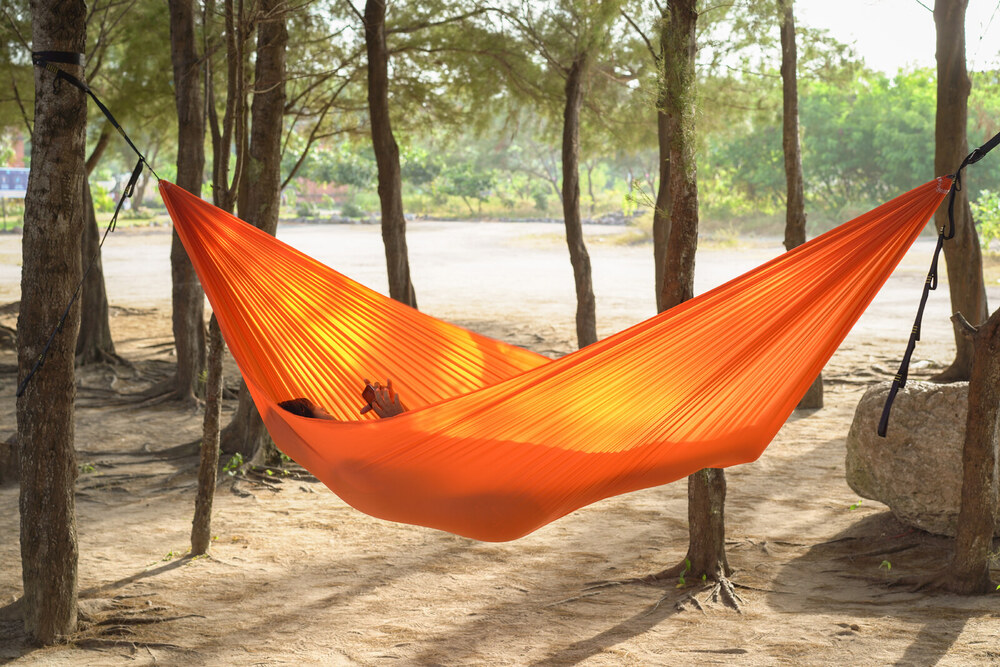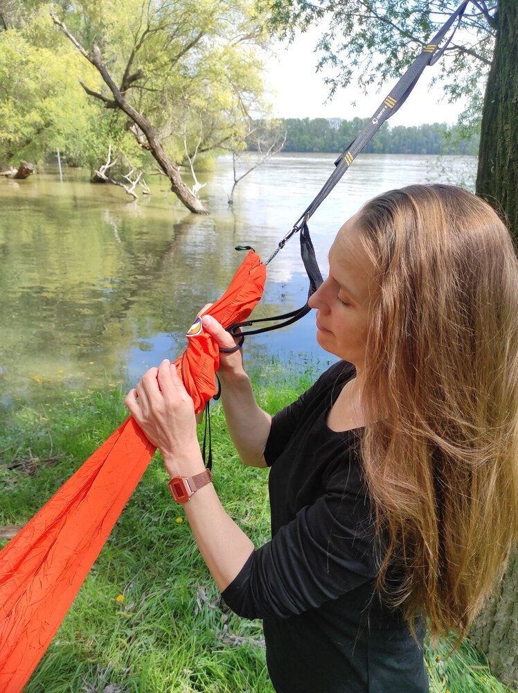 A függőágy mindkét végén 10KN teherbírású ultralight karabinerek vannak, ez a csomag része.
