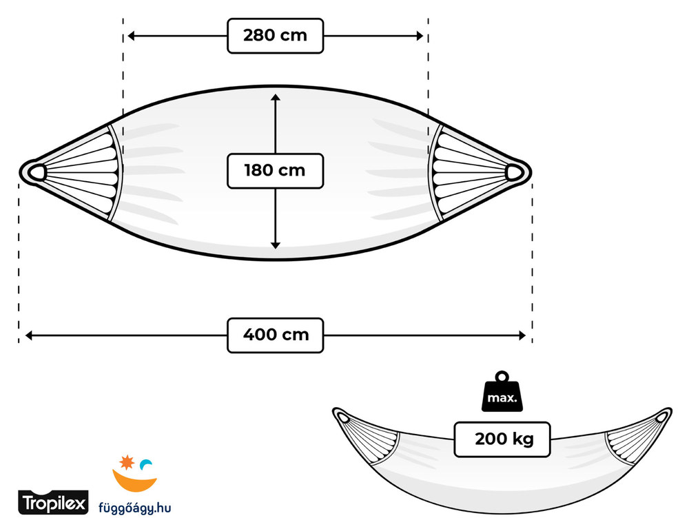 - 180 cm széles, 4 méter hosszú, ez a sztenderd családi méret, 200 kg teherbírással